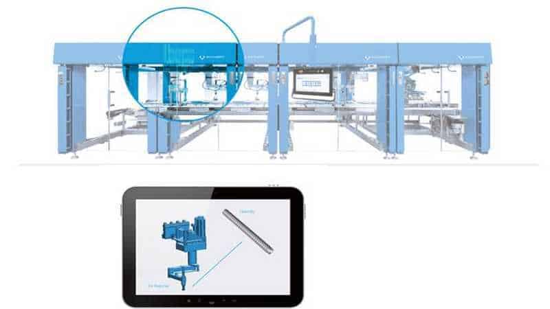 Un elemento centrale sarà il “gemello digitale” della macchina, come dice Schubert. Si tratta di un’immagine tridimensionale della macchina TLM che può essere spostata in tempo reale utilizzando il codice originale del controllore della macchina confezionatrice VMS.